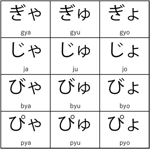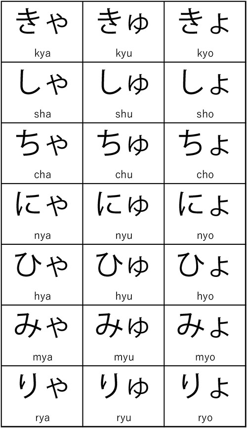 Pour former une syllabe composée, il suffit de combiner deux kana : le premier sera écrit en taille normale, et le second en plus petit à la suite. Par exemple, pour la syllabe “kya”, il nous faut prendre le kana き (ki) et le faire suivre par le kana や (ya) en plus petit, ce qui donne きゃ